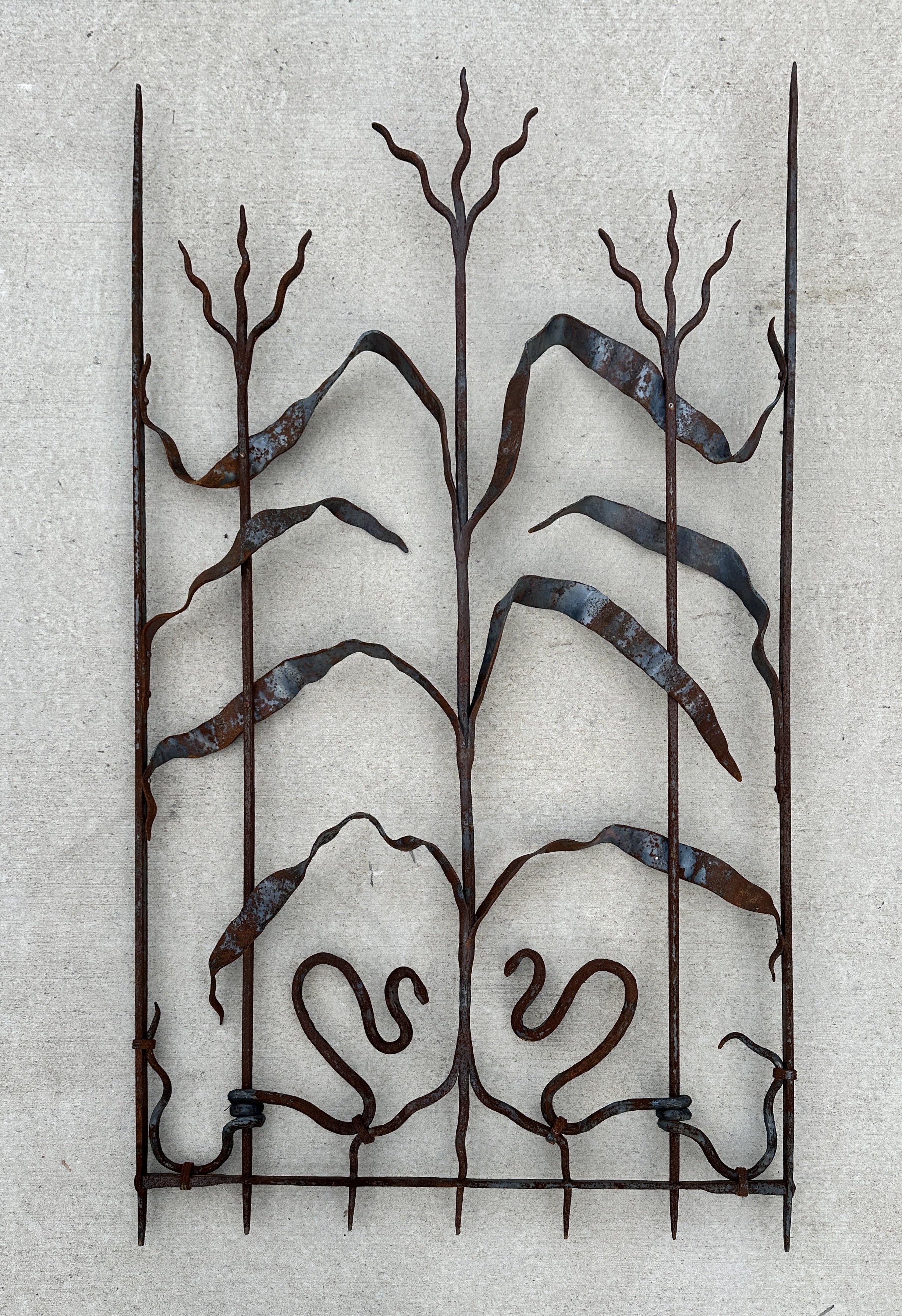 left: five-foot, hand-forged garden gate with forge welded cornstalks, mortise and tenon joints, and forged snakes attached with collars.(mild steel, 2025)