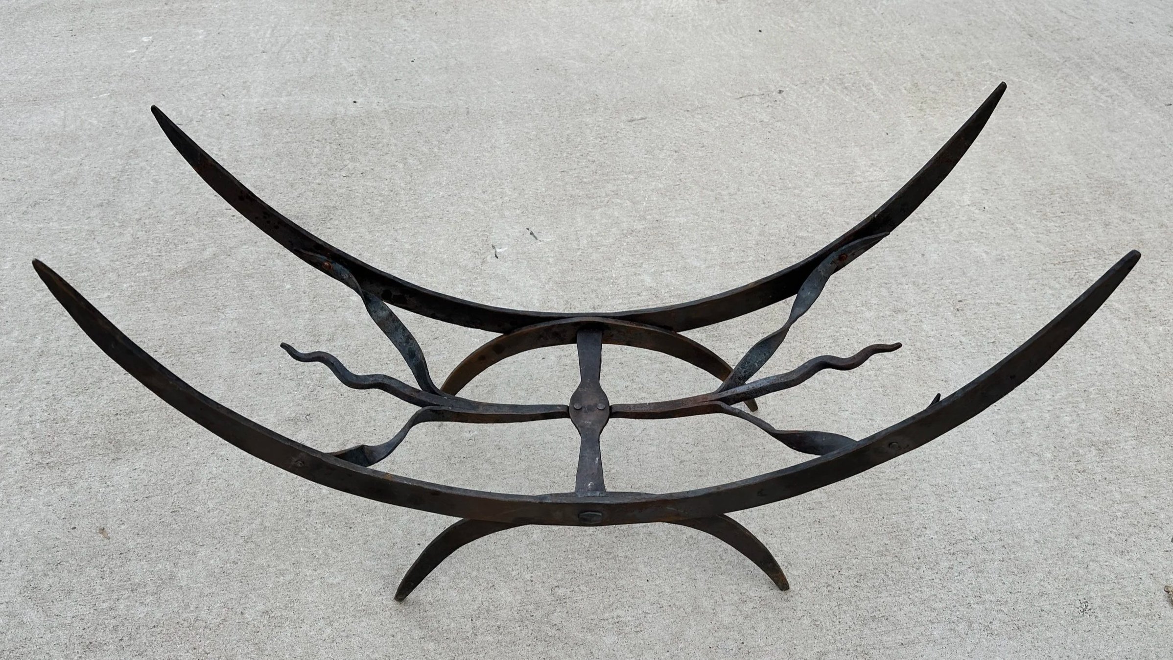 above: hand forged firewood holder, with forge welded flame and leaf elements and mortise and tenon joints.(mild steel, 2024)
